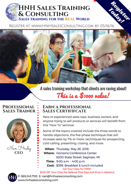 HNH Sales Conference is a one day sales workshop for new and experienced sales professionals. This event takes learning to a new level with multi sensory interactive learning for greater retention. Topics reviewed are research, cold calling, rapport building, discovery, building your value, handling objections, and closing techniques. The 5 phases of the sales cycle are intertwined with useful tips to gain more sales. Sign up by 5/16 and receive one free hour of coaching. Take your sales to the next level today.