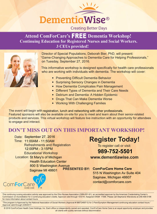 This free informative workshop is designed specifically for health care professionals who are working with individuals with dementia. Continuing education for Registered Nurses - 3 contact hours and Social Workers 3 CEUs provided. http://www.dementiawise.com/